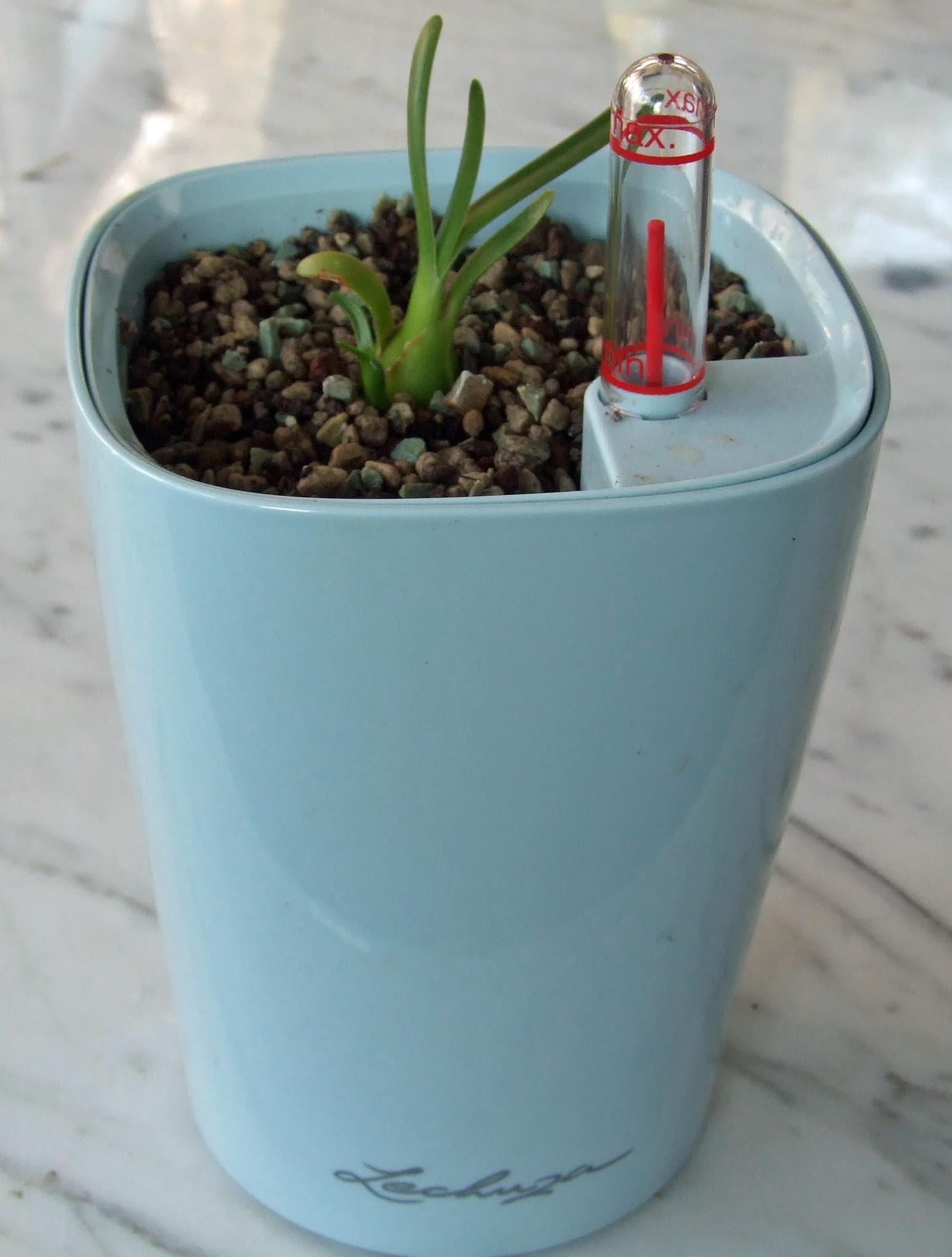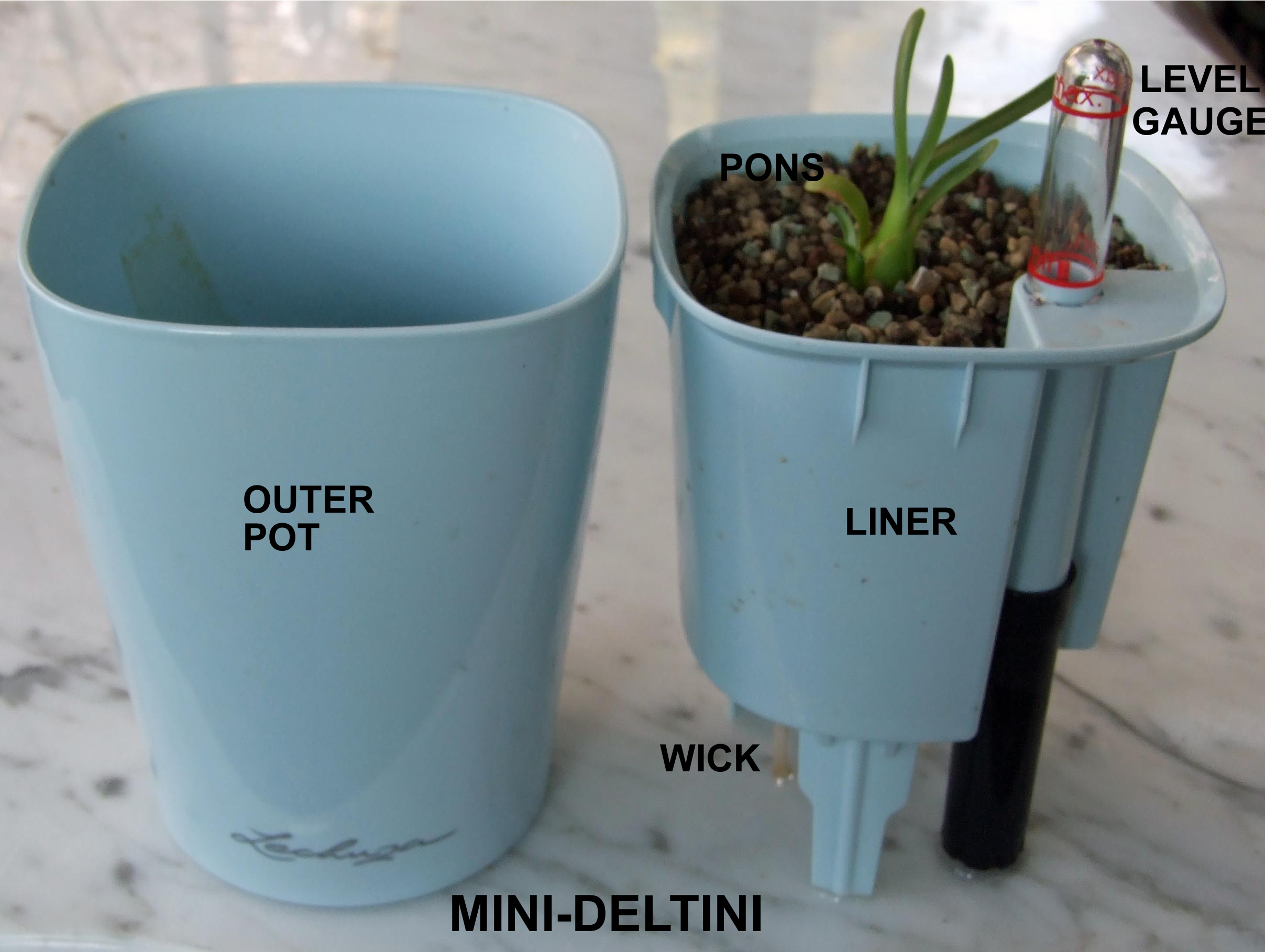 Another Self-watering planter that I've used to grow the small Worsleya is the Mini-Cubi ; an advantage to the Mini-Cubi is the transparent liner where you could see the root system. It includes the outer pot, transparent liner, level Indicator and PON (non-organic potting mix) & written instruction. see below