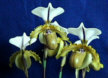 of all paph. hybrids. Large blooms, 3-5 per stem. Dorsal sepal white, striped