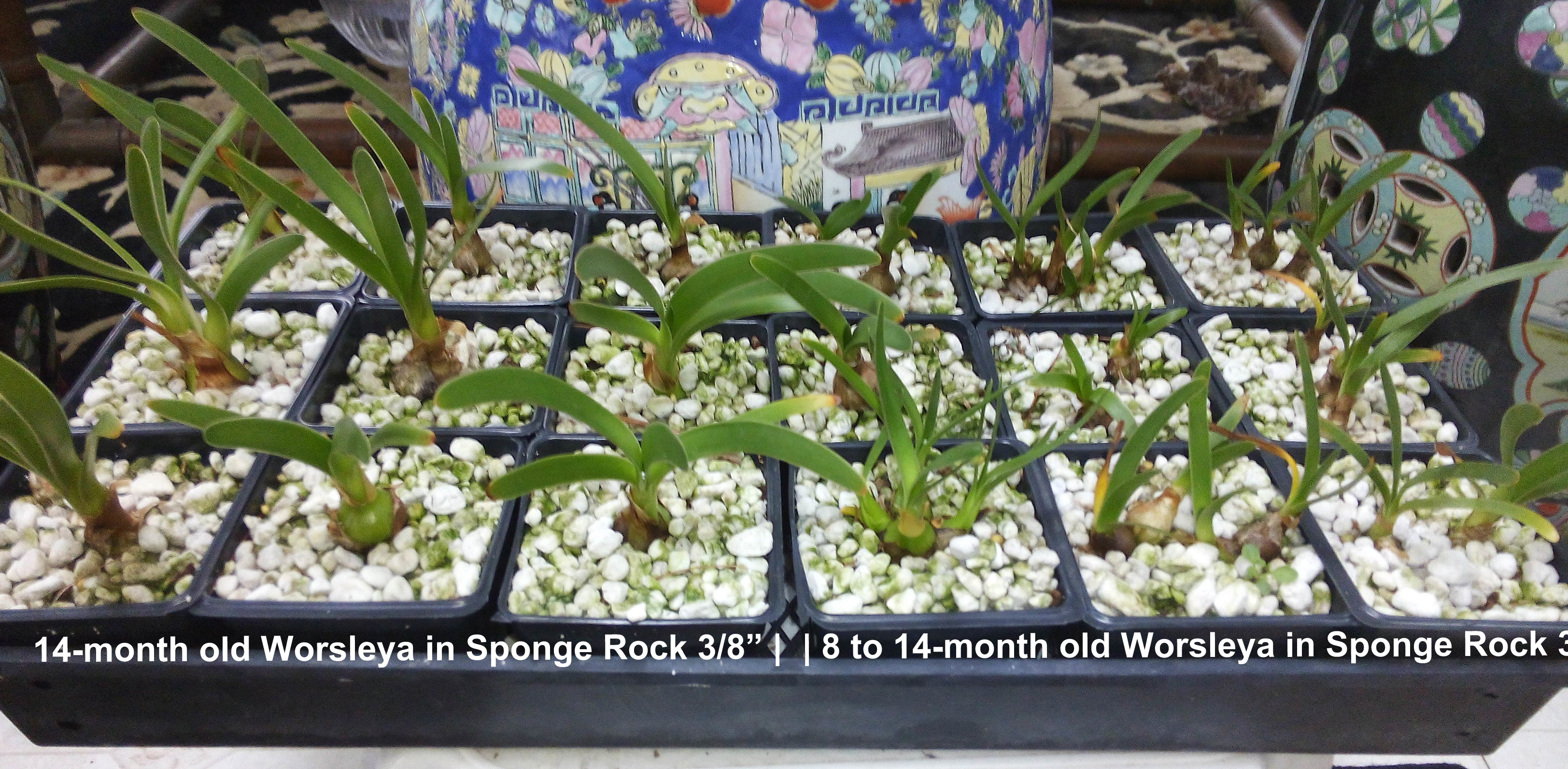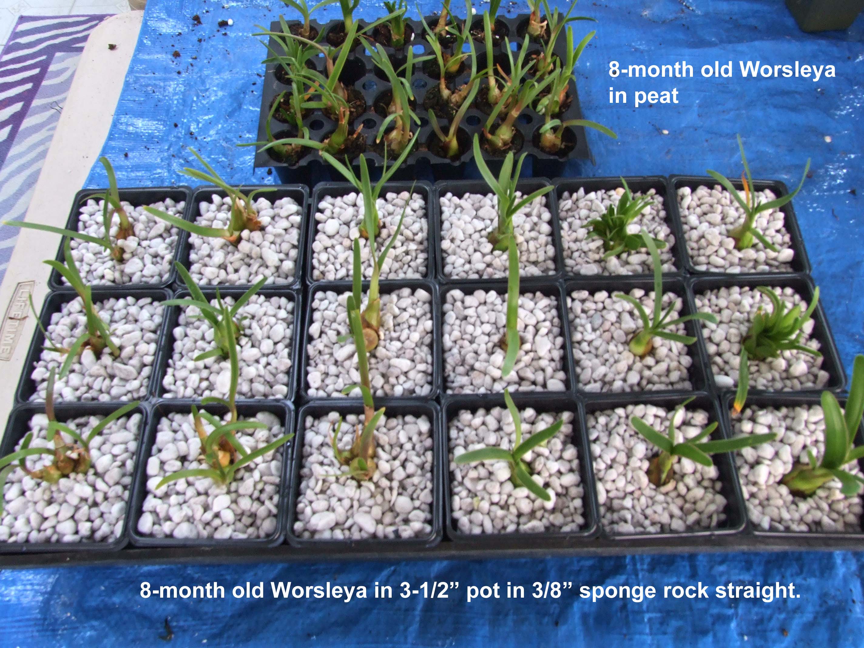 Growing the small Worsleya in a 72-cell tray in Winter, I grow them over a heat pad (keeps the roots warm) with ambient temperature of 60F and up and expose them to full sunlight. Watering could be every 2-3 days depending on how fast they dry out. So even in winter, they're growing. As it warms up in Early Spring, the heat pad is turned off and everything else remains the same. The 8- month old Worsleyas, half of the 8-month old batch already bare-rooted and the other haff still encased in peat are now transplanted over to a 3-1/2" pot using either Sunshine #4 or equivalent commercial peat moss based potting mix or Straight Canadian Sphagnum peat moss or straight 3/8" sponge rock. For the commercial peat moss based potting mix or the Straight Canadian Sphagnum peat moss, I let it dry out (barely) before watering again. On the 3/8" Sponge Rock, since there's no visual indication as to whether its dry or moist, I have to lift up the pot to check its weight. (Heavy its wet and light if its dry) prior to watering once to twice a week in the Spring and I'd suspect every day or two in Summer depending on how fast they dry out.. Be aware that by using organic potting mix such as the commercial peat moss based or Straight Canadian Sphagnum moss, its efficacy diminish over a period of time as it breakdown. As it breaksdown, its water holding capacity also increases so if you're watering schedule is fix, you'll end up overwatering the plant, hence the need for repotting every year or two depending on the severity of the breakdown. Using non-organic potting mix such as the 3/8" sponge rock although great as a potting mix due to its being inert, pH neutral, absorbs water readily and provides aeration and drainage but also pose some problems like the need for an indicator for the watering (sponge rock looks the same-white whether its wet or dry) and you'll know when its too wet as the top starts to turn green (algae growing) over a period of time. Great thing about inert potting mix is they don't break down thereby can be reused if repotting is required once the plant has outgrown the pot.